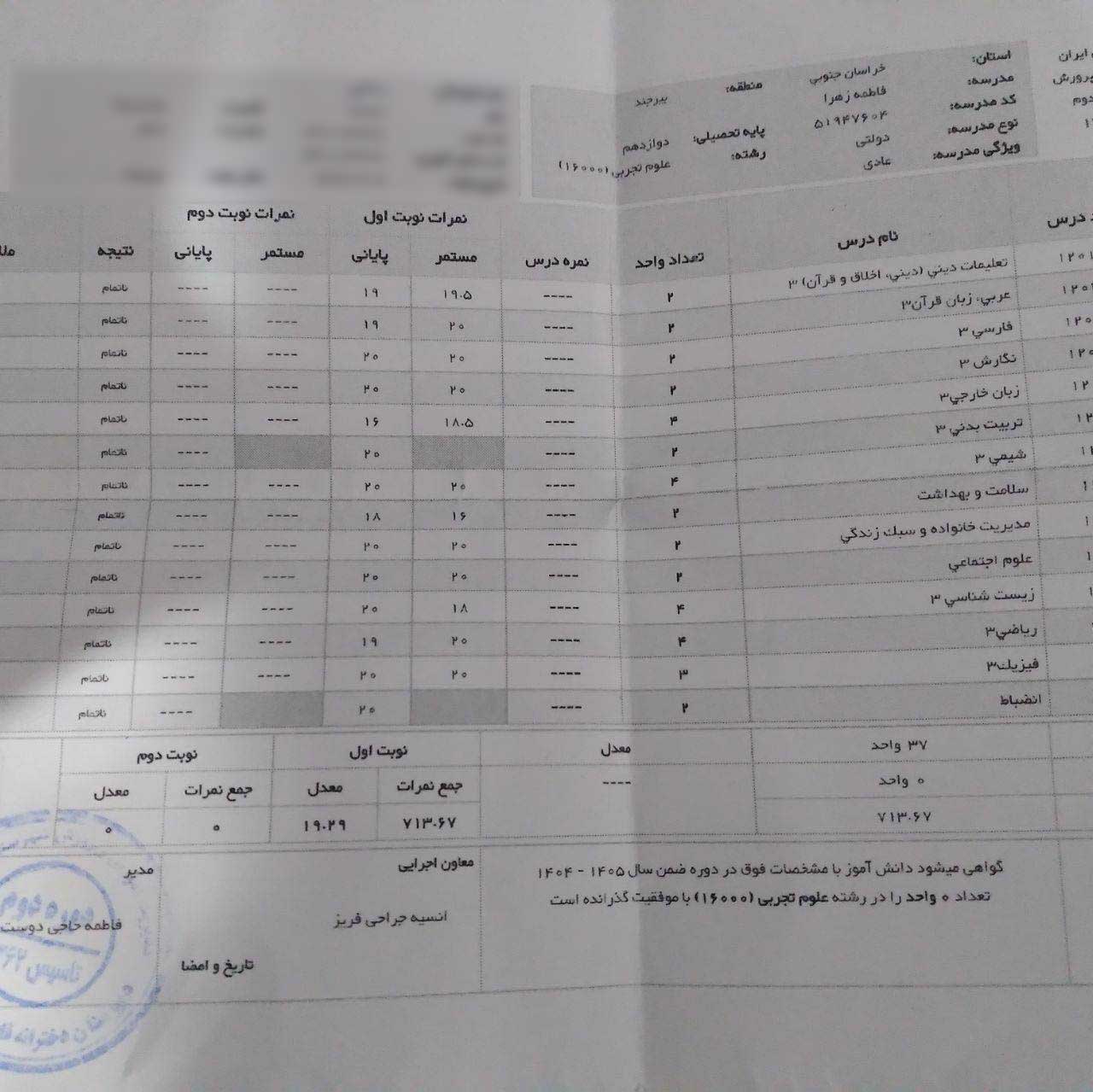 کارنامه نوبت اول اسرا فتحی دوازدهم تجربی 😌